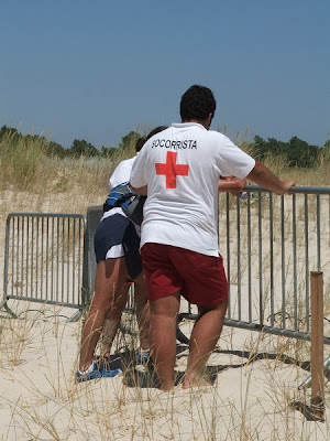 Dou mais uma curva para a direita. Desta vez era a última. Lá muito longe avistava o desejado pórtico que parecia minúsculo. Mas pronto… estava à vista o que ainda tinha para correr. Bebo os últimos goles de água, aproximo-me e, como a distância mais curta entre dois pontos é um segmento de recta, procurei a perpendicular ao pórtico, para não entrar lateralmente. Asneira ! Andei para ali a contornar chapéus e toalhas, a incomodar banhistas, até que um elemento da organização me vai encaminhar para o corredor final. É que eu deveria ter continuado por mais alguns metros junto à água. Mas a verdade é que o pórtico também deveria posicionar-se na perpendicular desse corredor para não induzir em erro.