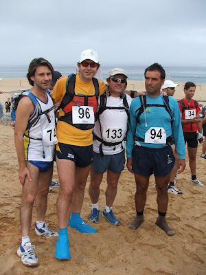 À medida que a distância ia sendo percorrida, os atletas dispersavam-se mais. Cada vez era maior o espaço entre o da frente e o de trás. “Levanto o pé” por alguns minutos e olho para trás. Vinha lá a Analice, a 50 metros! Inconformado, resolvo abandonar o estado de “relaxaria” em que estava a correr e, progressivamente, aumentar o andamento sem provocar grande “choque”. Passado um bocado, talvez meia hora, volto a olhar para trás e já não a via. Bom, a coisa compôs-se. Por volta dos 15 Km, os ténis é que começaram a meter areia e eu estava a sentir que uma bolha estava a preparar-se para surgir no dedo grande do pé direito. Antes que fosse tarde, resolvo então utilizar o “material” que estava destinado a esta eventualidade : -“arreio” a mochila e tiro de lá um saco de plástico e um “resguardo” também de plástico. Descalço-me , tiro a areia dos ténis, lavo as peúgas encho de água o saco e vou sentar-me no tal resguardo, para me calçar de novo, podendo tirar a areia dos pés na água do saco! Nisto passa o Eduardo Estevez, que me cumprimenta e a quem digo, por graça, que ia acampar ali (vontade não faltava!) e, depois de calçado de novo e “tralha” arrumada, retomo o caminho. Noto que me vou aproximando de um atleta (pudera… ele ia a andar!) vestido de cor-de-laranja . Era um rapaz meu conhecido e conterrâneo, o Luís Oliveira, estreante nestas andanças. Dirijo-lhe uma palavra de incentivo e continuo, como se estivesse muito melhor do que ele. Mas não. Corri talvez uns 200 metros mais e pus-me, também, a passo. Ele fez um esforço, aproximou-se e lá fomos os dois andando… na maior. E quem é que estava a chegar perto de nós, quem era? A Analice! Nãããooo! - Bora, Luís.E ele veio comigo até aos 28,5km, local do abastecimento.