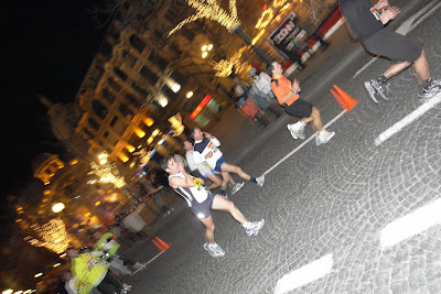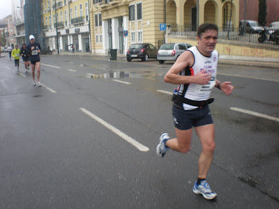 Eis que sou novamente "caçado" pelo Helder Francisco que soube dosear o esforço muito melhor que eu. Alí para as bandas do Cais do Sodré, cerca dos 35km passo o José Valentim que, ia mais lento. Em sentido contrário, vinham uma série de altetas que apontavam para as 3h, empenhadíssimos e concentrados, que nem respondiam ao meu grito(Herculano Araújo, Jorge Serra, Nuno Espírito Santo, Luis Mota) . Chego então ao desejado retorno dos 37km, na esperança que o vento desse uma ajudinha. E deu! pouca, mas deu! Vou vendo, agora, os que iam atrás de mim. Uns a ganharem-me terreno outros nem tanto. Eis que aos 39km (conforme disse no post anterior) aparece ao pé de mim o Joaquim Adelino, decidido a "fazer-me forte" para não claudicar nos últimos metros. Tirou-me o retrato e tudo (que ainda não consegui copiar do seu blogue ).Um pouco mais de esforço e …a entrada triunfal na Praça do Comércio.