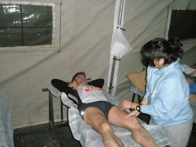 A conselho do Luís e também para aproveitar o abrigo, pois começava a chover novamente, entrei na tenda da massagem. Não havia muita gente pelo que fui rapidamente atendido. Devo dizer que não sou muito disto, mas aceitei. Deito-me na marquesa e uma jovem simpática perguntou-me onde é que me doía mais as pernas. Resposta difícil, mas lá disse que eram os gémeos (e se calhar não eram). Com uns sacos de gelo, massajou-me energicamente as pernas e, de seguida, faz o mesmo com um creme de massagem (acho eu). Fez-me uns leves alongamentos, manipulando os pés e finaliza com uns movimentos de descontracção muscular. Brilhante! Agradeci, levantei-me, calcei-me e pus-me a andar. Para meu espanto, o “andar novo”, meu inseparável companheiro sempre que termino uma maratona, desapareceu! Movia-me com a maior das naturalidades e… ria-me por dentro, eheheh. Volto a pôr a manta pelos ombros e encaminho-me para a carrinha, quando se aproxima de mim um segurança, que me diz : “- La manta é para ficar!” Dei-lhe a manta, com vontade de lhe dizer para limpar o c… com ela, e fui à chuva.