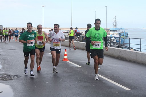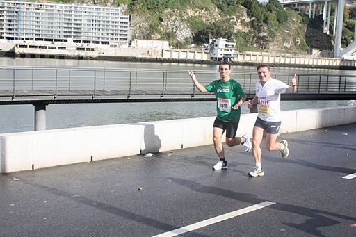 As contas estavam feitas (embora o Cláudio estivesse um bocadinho renitente em aceitá-las) : a 5 minutos por Km, faríamos a prova em 3,30h ! Como ele levava um cronómetro daqueles que apita em cada km, avisou logo que, o primeiro km ia demasiado lento. Não admira : pelotão ainda compacto e uma subida de cerca de 500m...Havia tempo para recuperar, mas abriu-se um bocadinho o passo e ao 2º km já estava tudo certinho. (Isto é coisa que não se deve fazer, mas pronto...). Estávamos a passar à Casa da Música quando passamos pelo João Hébil que ia calmamente com o seu amigo Javier e não se deixou impressionar pelo nosso andamento (e bem, pois no próximo Domingo vai fazer a Maratona de Nova Yorque e tinha de se controlar). Pela Avenida da Boa Vista abaixo, mesmo a travar íamos com um ritmo muito mais rápido que o previsto, mas como nenhum de nós ia em esforço –por ser a descer, certamente- lá nos deixámos ir a “amealhar”, dizíamos na brincadeira, porque sabíamos que poderíamos vir a ter de gastar todas as “economias” feitas. Aos 7 km, diz o Cláudio: - já “amealhámos” um minuto em 7 km! Daqui a bocado, vai ser 1 km em 7 minutos!”. Rimos, mas sabendo que era muito provável que assim acontecesse.
