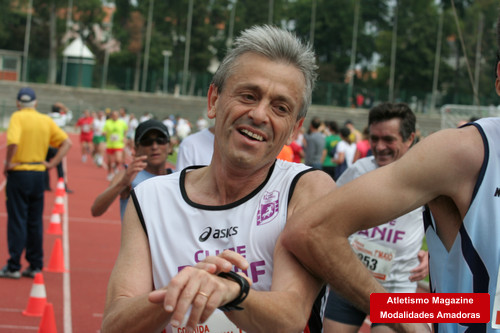 Já na Av.da Igreja, a pouco mais de 1Km da meta, vejo lá à frente, um colega de equipa e reparo que, mesmo sem forçar, lhe vou ganhando terreno. Entramos na 1º de Janeiro e logo a seguir no Estádio. Continuava a ganhar-lhe terreno e vi que era o Fernando Celestino. Ao entrar na última curva da pista, estava ele a uns 20m, pensei:- “Bom… vou apressar para ver se chego junto com ele para a rubrica da nossa equipa, “De mão dada com…” onde se coleccionam imagens de chegada conjuntas. Rapidamente o apanhei e dei-lhe um incentivo. Ele reagiu e sprintou. Eu não quis ficar a trás, prolonguei o “forcing” e ultrapassámos um outro atleta, ele pela direita e eu pela esquerda. Sem querer, e já em cima da meta, dei um toque tangencial a este atleta que acabara de ultrapassar, que o irritou, mais pelo susto que pelo desequilíbrio.