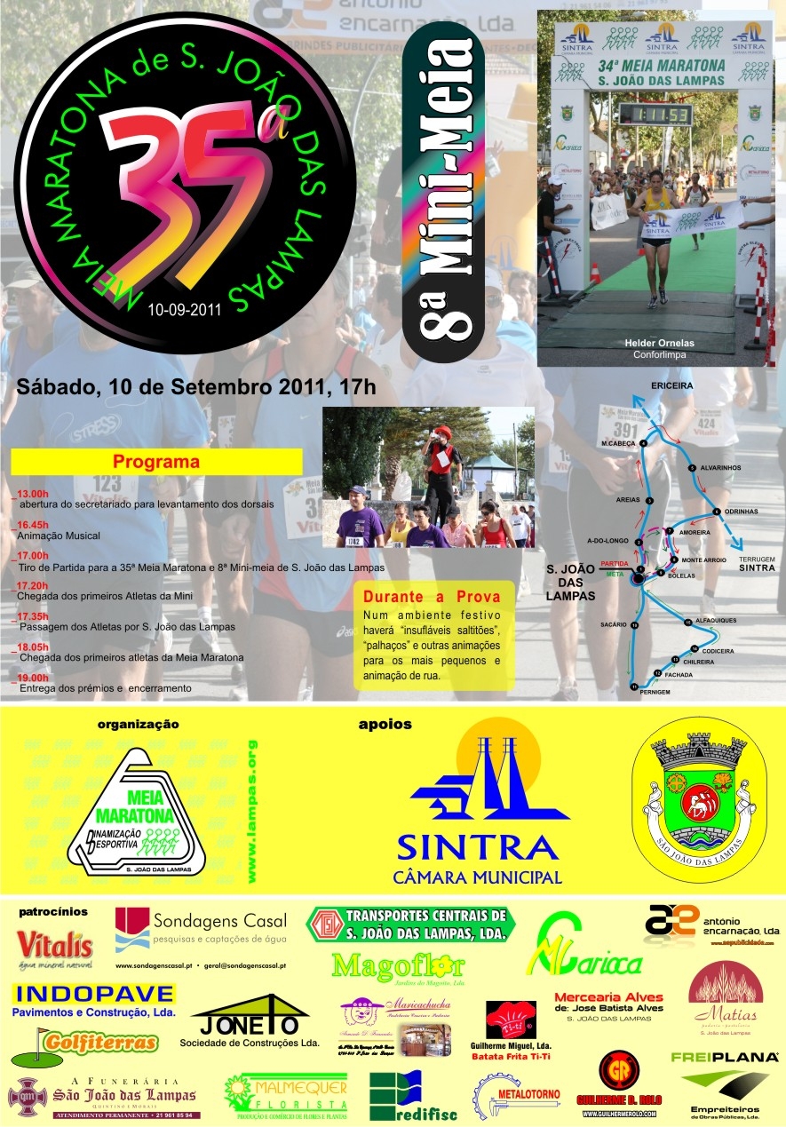 Concluída que está a 35ª Meia Maratona de S. João das Lampas, podemos dizer que nos sentimos satisfeitos com os resultados obtidos, quer pelo número de participantes que continua a subir (com mais 10% que em 2010) atingindo os 421 a cortar a meta, quer ainda pela forma como a Prova se desenrolou.